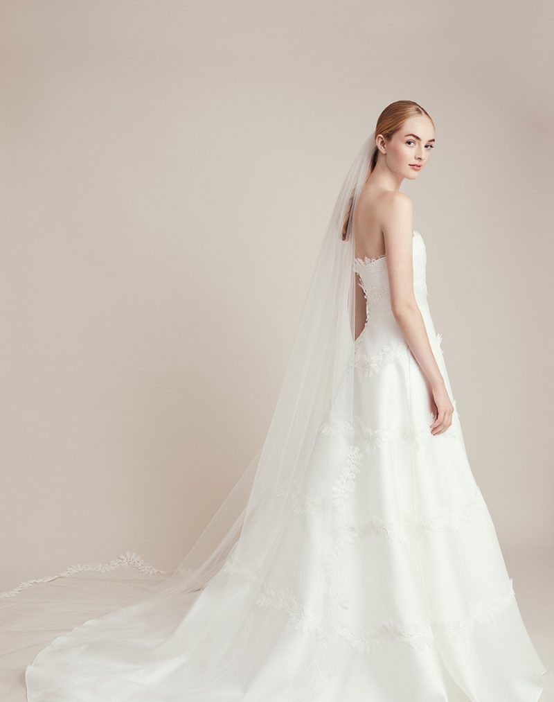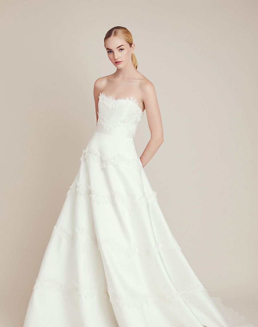 An A-line wedding dress gets romantic updates to create a beautifully unique, poetic wedding dress. With visible boning details that add silhouette-defining structure to the sheer sweetheart bodice and removable swag sleeves for an off-the-shoulder look, the gown is finished with embroidered floral appliques that cascade down the airy, tulle skirt. Glittery layers add sparkling dimension, and the look is finished with a hidden skirt slit.