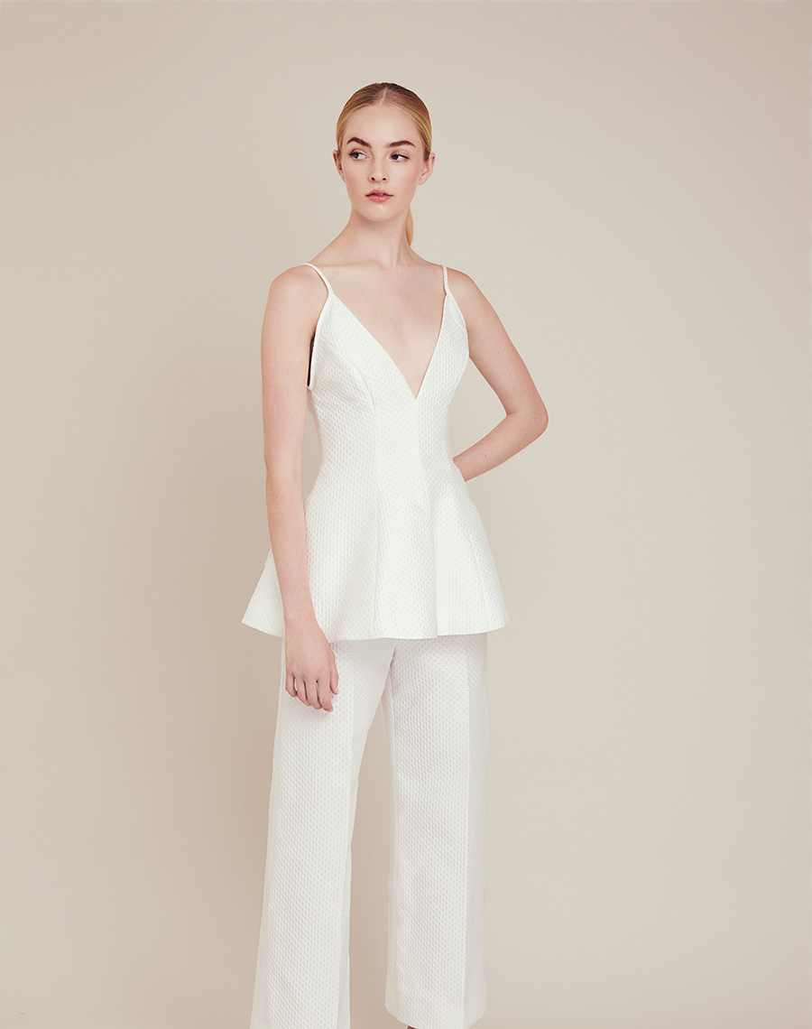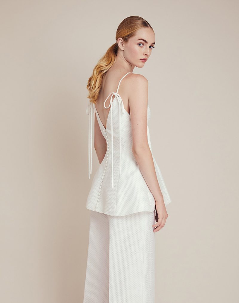 A crisp and classic look for the traditional bride with a fashion-forward streak, this mikado trumpet gown features an off-the-shoulder cuff neckline and back button detail that goes from the neckline to the end of the train.
