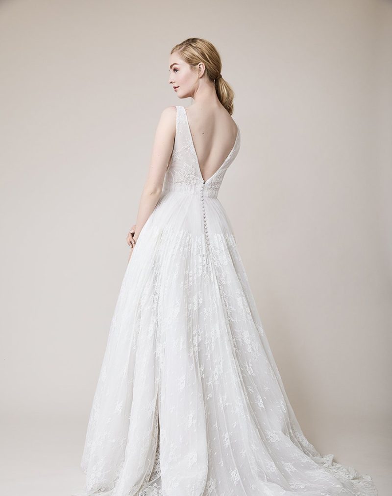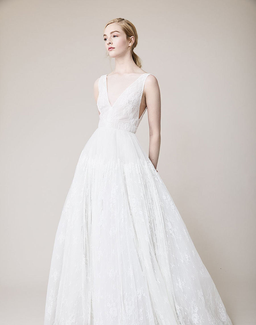 A traditional wedding dress with just a hint of drama, this structured satin ball gown features a plunging V-neckline, a low back with wide-set straps, and a figure-flattering pleated cummerbund waistband. Side pockets and a snap-in beaded mesh coverage panel complete the dreamy silhouette.
